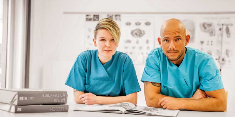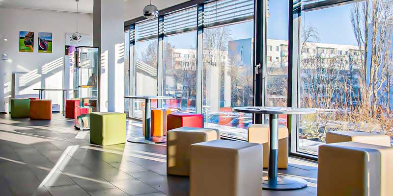 Unser Campus am Pusch­kin­ring ist von grund­auf konzi­piert für Bildung – er bietet große und helle Unter­richts- und Semi­nar­räume, die modu­lar verän­dert werden können. Zudem gibt es spezi­fi­sche Räume wie die Druck­werk­statt, das Skill­cen­ter (der Gesund­heits- und Pfle­ge­schule), eine Fach­bi­blio­thek oder das Netz­werk­la­bor.